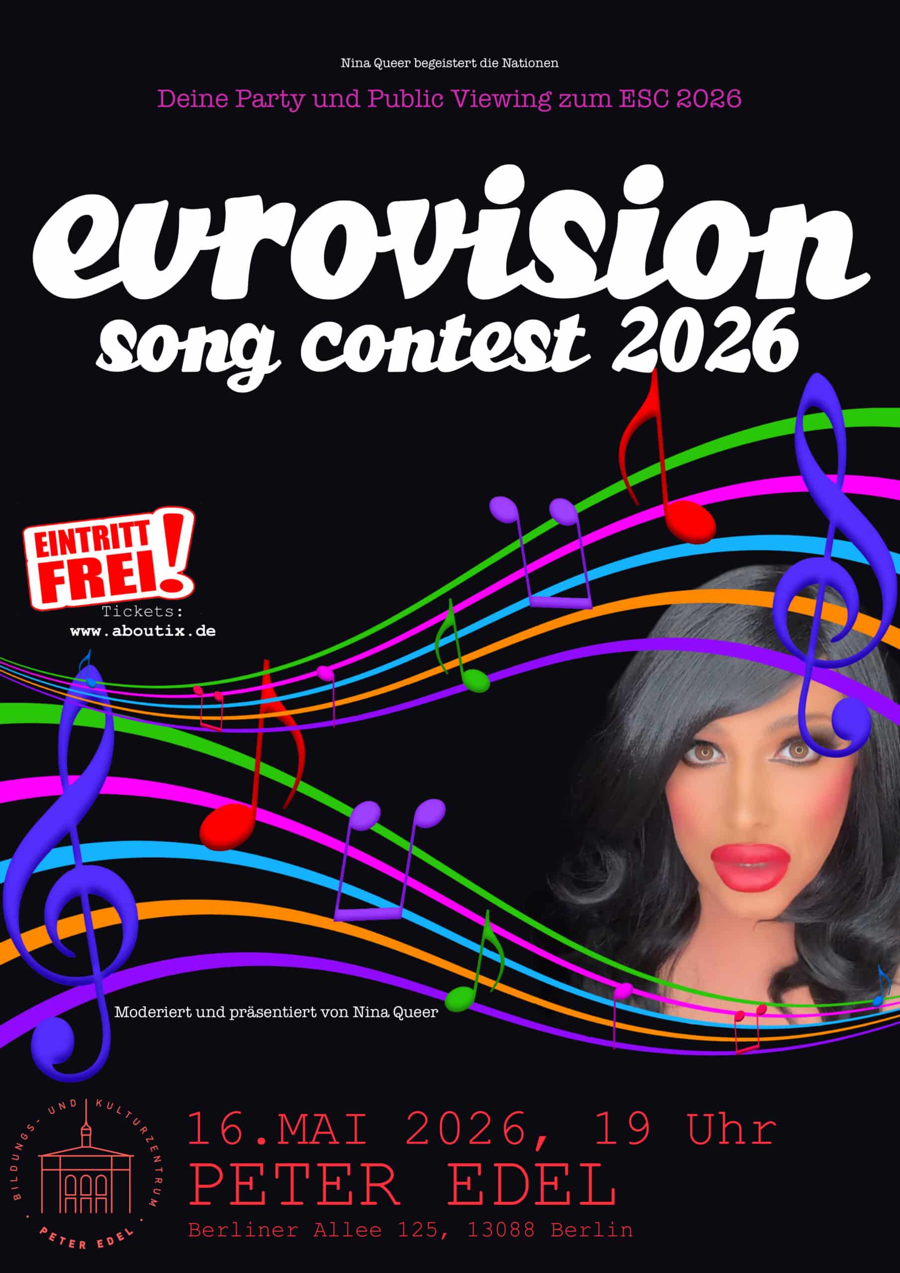 Seit 25 Jahren begleitet TV-Star und Bestsellerautorin Nina Queer ESC-Begeisterte und Musik-Freunde durch die Eurovision-Nächte. Auch in diesem Jahr setzt die Kult-Veranstaltung nicht aus! Im Gegenteil: Mit dem großen Ballsaal im PETER EDEL, gibt es eine neue und besonders glamouröse Location.
